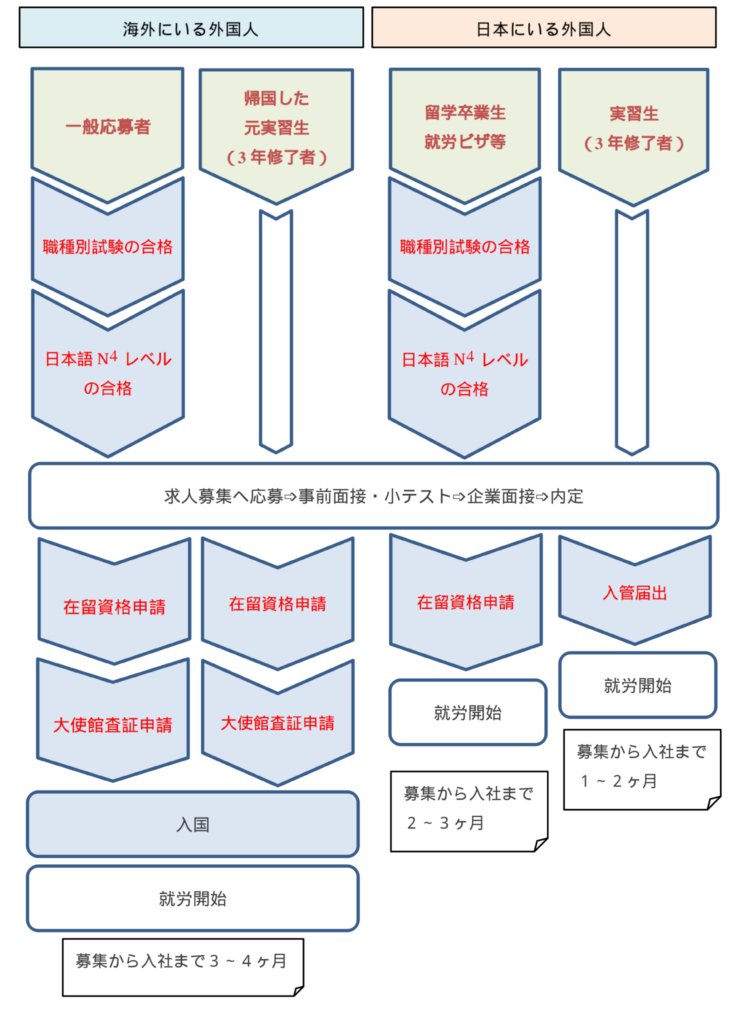 現在『特定技能』という在留資格を入管に申請するためには、該当する14分野の職種別の試験と日本語能力N4レベルの試験に合格する必要がありますが、技能実習を終えて帰国した元実習生や、現在日本で働く実習生が3年満期で修了するとそれらの試験は免除されます。
