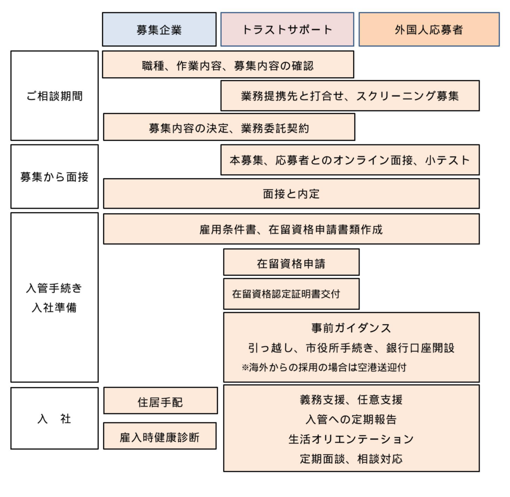 トラストサポートでは特定技能外国人を企業にご紹介するために海外から実習生を派遣している送出し機関や日本語学校と業務提携し、母国に帰国した元実習生や日本国内の特定技能外国人や特定技能で就労を希望する実習生を募集する十分な体制が整っています。