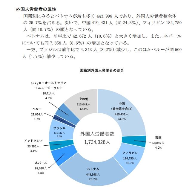 外国人労働者といえば派遣会社から紹介されて工場で働く日系ブラジル人を真っ先に想像されると思います。日本で働く日系ブラジル人、ペルー人労働者は合わせて160166人です。しかし、実際日本で働く外国人の国籍別で一番多いのはベトナム人443998人です。