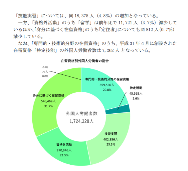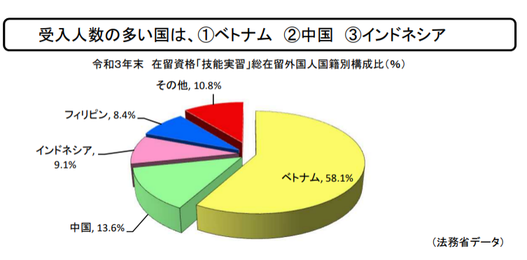実習生として日本に来ている外国人で一番多いのはベトナム人約20万人と断トツに多く次いで中国人約5万人そしてインドネシア、フィリピンの順です。